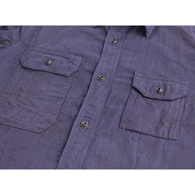 ウエス No.501603インディゴドビーワークシャツインディゴロープ染色の糸を使い、ドビー織機で特徴的な織柄を出しました。織り模様が生み出す生地の