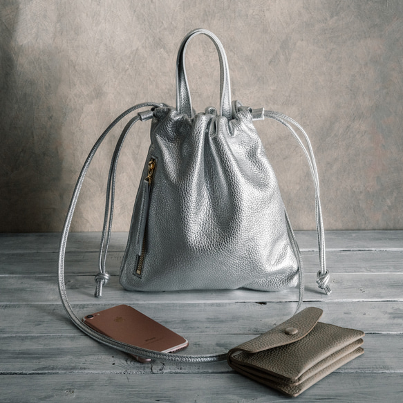 ※こちらのページでのご注文はシルバーカラーになります。 (カラー選択よりお色を変更してもご注文いただけます) ※写真の詳細は一部他のカラーを使用しております。 使い勝手の良いサイズ感の縦長巾着タイプです。 メインボディーは縫い目を極力減らしたステッチレスデザインで、ふんわりした大人可愛いデザインに仕上げました。 すぐに取り出したい小物の収納に便利なアウトポケット付き。日常や旅行に活躍してくれるシンプルデザインです。 ショルダーストラップは結び目で調節。(取り外し可能) アウトポケットにはiPhone Pro Max系のサイズのスマートフォンが入ります。(例:iPhone15 Pro Max外寸サイズ76.7×159.9×8.25mm) 皮革はイタリア製高品質ソフト牛革を使用。 使い込むほど良さが醸し出される皮革です。 ●他の色目もございますのでギャラリーをご覧ください。 【素材】 本体:牛革(イタリア製高品質ソフト牛革) ショルダーストラップ:牛革(本体同材) 巾着紐:牛革(本体同材) 裏生地:綿(色:サーモンピンク系) 【サイズ】 本体 : (外径約) 縦25㎝(巾着オープン時)(巾着時12㎝) x 幅24㎝(底) ショルダーストラップ:最長立上り60cm(無段階調整可/結び留め) ハンドル(持ち手):幅1.5x立上り10cm アウトポケット: 口約14cmx奥行約18cm(ファスナー色ゴールド) 総重量:約310g 【在庫状況 & 納期のついて】 ご注文を頂いてから丁寧に製作するため、5日前後の制作期間を頂いております。(祝祭土日を除く) ※製作が込み合っている場合は出荷が数日遅れることがございます。 ※送り先に関しましては一件のご注文に対して一か所へのお届けに限ります。 ※年末年始及び大型連休のお届けに関しましては[プロフィール]ページをご覧下さいませ。 ●ラッピング(有料)は簡易ラッピング袋を同封させて頂きますので、お手数ですがラッピングはお客様でお願い申し上げます。 ・こちらの商品を使用中に起きた入れ物への破損や汚れ怪我などは一切責任を負いませんので予めが了承ください。 ・紹介写真と一部使用が変わることがございます。予めご了承ください。 (品質レベルを下げる事はございません) ・裁断箇所によって柄が写真とは異なることがございますので、予めご了承ください。 実際の色目と差がないように調整しておりますが、モニターの環境によって実際の色目と異なることがございます。予めご了承ください。 返品・交換につきましてはプロフィール欄にてご案内しておりますのでご参照下さいませ。 |