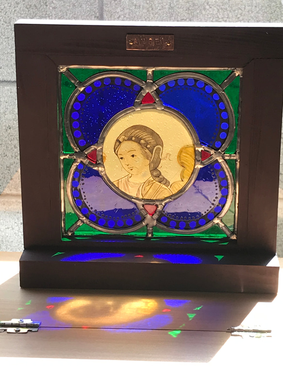 古いイコンに描かれた天使を、小さなステンドグラスのパネルにしてみました。クリスマスに如何でしょうか? 天使の周りは、緑、青、赤と、典型なステンドグラスに使われるガラスを配置してみました。 太陽光を通して、美しい色々が、下に映ります。 縦、横約21.5cm 奥行2.5cm ガラス部分、縦、横約15cm 額の上部に、ANGELと記した小さな銅板がついています。 額付きでこのまま飾る事ができます。 小さなパネルなので、飾る場所を選びません。 ステンドグラス、額、全て手作業で製作して居りますので、ご理解の上ご購入下さい。 |