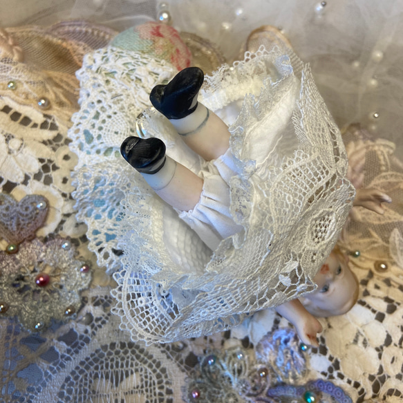アメリカのビスクドール作家にオーダーしたドールに服を着せています。アンティークレース使