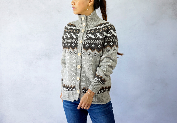 =================== 定価¥17,000のところ、20%オフ¥14,000でご提供! =================== 衿元の釦を外して衿仕様で着ていただくこともできます。 モノトーンでメンズライクなデザインでありながらも、 袖口リブ、裾リブ端に天竺編みを少し入れてクルンとさせることで 少し柔らかい印象に。 【素材】Wool 100% 【サイズ】着丈:60㎝、身幅:46㎝、肩幅:40㎝、袖丈(衿元~):53㎝、 【色展開】ホワイト、グレー ホワイトはこちら↓ ※モデル身長:158㎝ ※当店はサイズ変更等、受注オーダーは承っておりませんので、 ご了承くださいませ。 【生産背景について】 こちらの商品は、南米ペルーのアンデス山脈、標高約3,800mのところにある、チチカカ湖周辺にて、地元の編み子さんたちと一緒に、1つ1つ丁寧に、手編みで作っています。 アンデスの大自然の中、ゆったりとした時間が流れる中で編み上げられた、ぬくもりあふれる商品をお楽しみください。 【素材について】 ペルーのウール糸は軽くてボリュームがあることが特徴です。 アンデスの山域にある糸工場の、古い機械で紡績されているため、撚りもあまく、そして不均一な太さでの仕上がりに。 それがより一層味わいのあるニットに仕上がります。 また、他の産地のものに比べて、油分や水分が少ないため、ボリューム感たっぷりの見た目なのに、着用してみるとふわっと軽やか。糸の撚りがあまい分、空気がたっぷりふくまれていて、保温性にも優れています。 アルパカは、アンデスの山岳地帯に生息するラクダ科の動物。 ウールに比べ、薄くても暖かく、柔らかくしっとりとした独特な風合いが特徴です。 【サイズについて】 手紡ぎのアルパカ糸や、ざっくりとした撚りの糸が特徴であるウール糸を使用し、1つ1つ手編みで生産しているため、サイズのバラつきや個体差があります。表示しているサイズは “目安” として、ご参考ください。 【お取り扱いについて】 ドライクリーニングをおすすめしております。 ご自宅でのお洗濯は型崩れ、縮みの原因となりますのでお避け下さい。 当店の商品には品質表示ネームの取付がありません。 商品発送時にお取り扱いについての説明書をお付けしてますので それをご参考の上、お手入れしていただきますようお願いいたします。 【写真について】 画像の商品は光の照射や角度により、実物と色味の見え方が若干異なる場合がありますことを、ご了承ください。 #秋冬新作2023 #新色新柄2023 #冬支度ハンドニット2023 |
