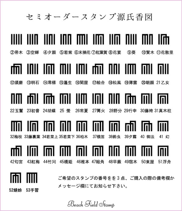 源氏香スタンプ全部セットです。 2.帚木 (ははきぎ) 3.空蝉 (うつせみ) 4.夕顔 (ゆうがお) 5.若紫 (わかむらさき) 6.末摘花 (すえつむはな) 7.紅葉賀 (もみじのが) 8.花宴 (はなのえん) 9.葵 (あおい) 10.賢木 (さかき) 11.花散里 (はなちるさと) 12.須磨 (すま) 13.明石 (あかし) 14.澪標 (みおつくし) 15.蓬生 (よもぎう) 16.関屋 (せきや) 17.絵合 (えあわせ) 18.松風 (まつかぜ) 19.薄雲 (うすぐも) 20.朝顔 (あさがお) 21.乙女〔少女〕(おとめ) 22.玉鬘 (たまかずら) 23.初音 (はつね) 24.胡蝶 (こちょう) 25.蛍 (ほたる) 26.常夏 (とこなつ) 27.篝火 (かがりび) 28.野分 (のわき) 29.行幸 (みゆき) 30.藤袴 (ふじばかま) 31.真木柱 (まきばしら) 32.梅枝 (うめがえ) 33.藤裏葉 (ふじのうらは) 34.若菜上 (わかな じょう) 35.若菜下 (わかな げ) 36.柏木 (かしわぎ) 37.横笛 (よこぶえ) 38.鈴虫 (すずむし) 39.夕霧 (ゆうぎり) 40.御法 (みのり) 41.幻 (まぼろし) 42.匂宮 (におうみや) 43.紅梅 (こうばい) 44.竹河 (たけかわ) 45.橋姫 (はしひめ) 46.椎本 (しいがもと) 47.総角 (あげまき) 48.早蕨 (さわらび) 49.宿木 (やどりぎ) 50.東屋 (あずまや) 51.浮舟 (うきふね) 52.蜻蛉 (かげろう) 53.手習 (てならい) 「源氏物語」54帖のうち、そのうち最初の「桐壺」と最後の「浮橋」はありません。 サンプル写真の3点は、個人的に好きな「明石」「若紫」「花散里」です(*Ü*) ・・・・・・・・・・・・・・・・・・・・・・・・・・・・・・・・・・・・・ 【印面サイズ】 押した時の大きさは1,5cm角です。 ・・・・・・・・・・・・・・・・・・・・・・・・・・・・・・・・・・・・・ ■写真のカード・インクなどは商品に含まれません。 ■Instagramでスタンプのいろんな使い方、多色押し動画紹介しています。 【beach.field.stamp】 ■こちらのセミオーダー商品は商用利用可能です。 ↓↓もっとたくさんのスタンプをご覧になりたい方はこちらから(*´∀`*) ↓↓ |