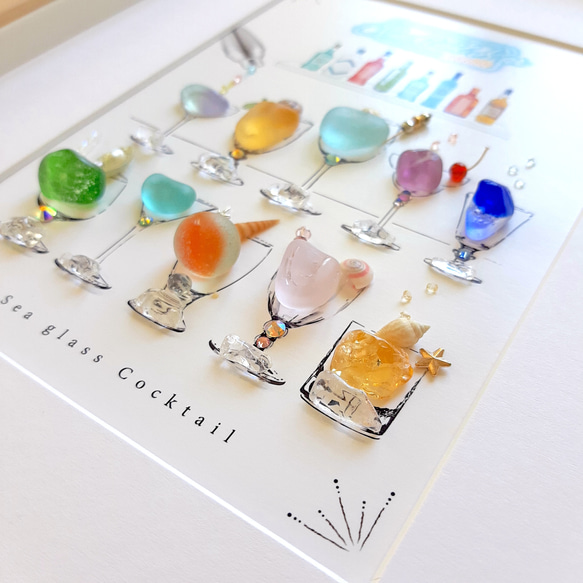 “海辺のカクテル・バー” Cocktail Bar・seaside シーグラスや天然石・貝殻、淡水パールなど詰め込んだ、宝石箱のような美しいカクテルです。色とりどりのカクテルが10種類。着色なしの天然素材そのものの色合いを、たっぷりとお楽しみいただけます。 黄色、紫、コバルトブルー&透明のツートン、メロンソーダのような緑&透明のツートン、赤ライン入りのシー玉、ピンクは、レアカラー・珍しいシーグラスです。 上一番左、下一番右の2つは天然石です。 赤いサクランボは天然石、グラスの底部分は透明な天然石で美しく飾りました。 バーテンダーがシェイカーで注ぐ、出来立てのカクテル。ロマンチックな海辺を眺めながら、ゆっくりと甘美なカクテルタイムを楽しみましょう。 シーグラスは、長い年月をかけて自然が作り上げた宝石のような存在です。一般的には、シーグラスが形成されるまでには20年から50年、場合によっては100年を超える時間が必要とされています。そのなかでもレアカラーや珍しいシーグラスの入手は非常に難しく、高い希少性があります。 ……………………………………………………………… フレームサイズ:A4サイズ(32×23・奥行き3cm、中身のデザインは2Lサイズ) フレームの色:ナチュラル 卓上でも壁掛けでも使えます。 奥行きがあるのでそのまま置くこともできます。 前面に透明板がつきます。 |