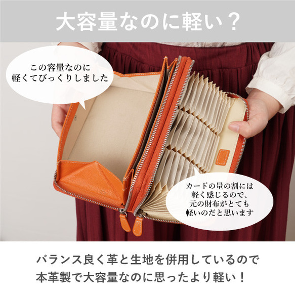 【micの長財布一覧はこちら】 長財布: ★仕様説明の画像について 中の仕様説明の画像には、オレンジを使用しております。 ★カラー選択について オプション設定の「種類」よりご選択ください。 ブラック/グレージュ/オレンジ/ネイビー 全4色 それぞれ小銭入れの中のお色が異なります。商品画像17枚目をご覧ください 【作品を動画でご紹介しています!】 お店のYoutubeチャンネルで作品をご紹介しています! 2分程度の短い動画です。是非ご覧ください! → 【おすすめポイント】 39枚もカードが収納でき、整理がしやすい大容量の長財布です。 ■カードポケットは39枚分! カードは縦に挿すジャバラ式で出し入れがスムーズ。 ラミネートされたカードも収納できます ■小銭入れは大きく開き、取りたい硬貨が見分けやすく探せます。 ■マチ付きのお札口が2つ付いています。 種類別に仕分けるのはもちろん、通帳・パスポート、スマートフォンも入れられます。 ■4つのフリーポケットもついているので、 レシートやチケットなど、お金とは別にしておきたい細かなものをしまい込むこともできます。 ☆革の産地 表 日本製牛革 /中 日本製 人絹 ・日本製 合成皮革 ☆革の固さ 初めは張りのある固めの手触り。馴染んでくると少しくったり。 ☆生地部分 レーヨン ☆カードポケット 39枚 ☆フリーポケット 5か所 ☆小銭入れ 〇 ☆お札仕切り 〇 ☆サイズ 横20cm×縦11cmx厚4cm ☆重さ 約300~320g※ ※重量は製品により個体差がございます。 ★ショルダーストラップを取り付けて、ショルダーポーチにできます! ご希望の方は、オプションよりご注文ください。 ※お取り付けには約2週間ほどお日にちを頂戴しております。 詳細は、下記ページをご覧ください。 ★革について 兵庫県たつの市で鞣し・加工された型押し加工を施したクロム鞣しの牛革を使用。 型押し加工をすることにより革表面が締まって、傷や汚れがつきにくくなります。 メンテナンスを含めて他の革より取扱いやすく、 初めて革製品を持つ、という方にも気軽にお使い頂けます。 ---------------------------------------- ★ギフトラッピング 無料で不織布ポーチへお包みいたします。 ラッピングご希望の方は、 ご注文カートに入れた後に「ラッピングあり」にチェックをお入れください。 #大容量財布 #長財布