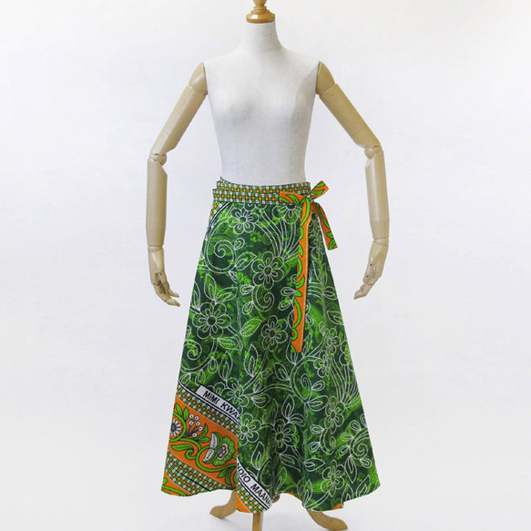 さっと巻くだけで、華やかな印象に! 存在感あるカンガのラップスカート ♦ フォルムの美しさ、柄を活かしたデザイン 最大の特長は、スカートフォルムの美しさと柄の配置です。 同じ柄のカンガ2枚を使って作った扇型の綺麗なラインが、ウエストから裾にかけてたっぷり広がっています。文字とフレーム柄は、裾の斜め後ろから前に向かって流れて来るように仕立ています。 ♦ さっと巻くだけ、楽な着心地 ウエストを紐で結ぶタイプなので、膨らむことなく見た目もスッキリ。調節も簡単です。 水通しをしたカンガから縫製しているので、最初からナチュラルな風合いを楽しんでいただけます。 アフリカらしい色合わせなのに、不思議と落ち着いた印象を与えてくれるカンガの色と柄。 トップスはTシャツやブラウス、シンプルなものと合わせていただくのがオススメ。素足にサンダルも素敵です。 コーディネートの主役となってくれるアイテムです♪