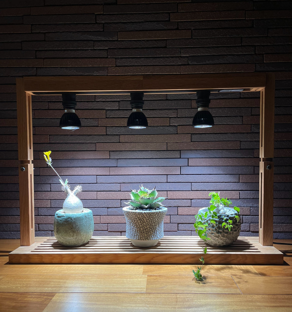 ナラ無垢材で製作しました。 木の風合いを生かして蜜蝋ワックス仕上げで、こちらの商品は背の低い植物用のインテリア性のある植物スタンドとなっております。 ソケット付ですので後々、ライトの種類を変えたりサーキュレーターを付けたり、カスタマイズできるかと思います。 (LEDライト3個、E26ライトソケット3個付) サイズ 高さ50㎝ 幅70㎝ 奥行17㎝ |