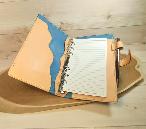 ターコイズとナチュラルのバイカラーが個性的なシステム手帳です。予定やメモなど使用す