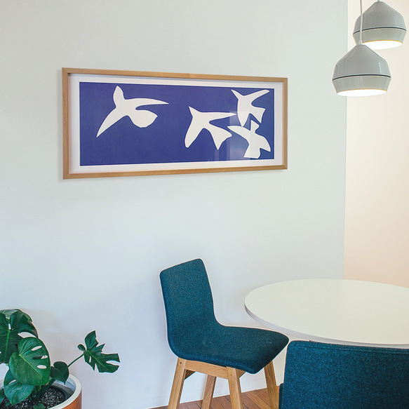 ナチュラルなインテリアに映える、アンリ・マティスのアートフレーム「青い鳥」。横長のフ