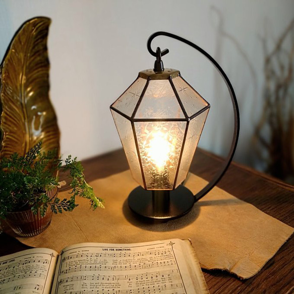 ステンドグラスの技法で制作したペンダントライトです。 シェード部分は六角形の12面体です。 使用のガラスは大小の星がちりばめられた『銀河』という名前のついた昭和型板ガラスと、結霜ガラスの組み合わせです。 出品中のテーブルランプⅰに比べて小ぶりなタイプです。 照明金具は置き型吊り下げタイプ コード長さ約190cm スイッチ付き 画像のLED電球が付属します。 LED電球使用可能。 E17口金 LED4w *画像は見本になり、お届けするシェードの柄(星の配置など)は少し変わります。(ガラスは同じです) *画像1枚目の撮影用の小物類は付属しません。 スタンドサイズ:高さ約27cm 幅約11cm(ソケット中心から) ベースサイズ:直径約11cm 素材:ガラス、ハンダ(錫60鉛40)、 真鍮、照明器具(E17ソケット) *作品は全てハンドメイドの一点ものです。ガラス作品は光の角度によって、色の見え方、透明感などが写真とは異なる場合がございます。 *ガラスの製法上、表面に凸凹、細かな傷や気泡がある場合もあります。 一つ一つ心を込めて製作しておりますが、ご購入の際はご理解頂きますようお願い致します。