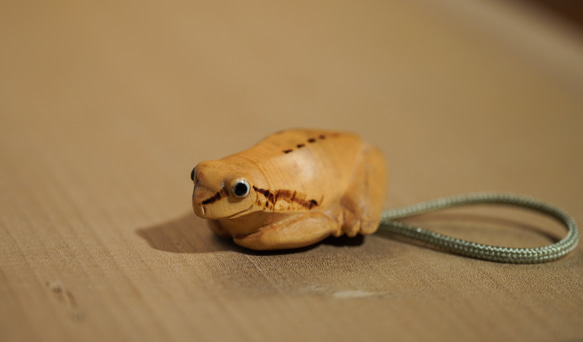 『作品名』雨蛙黄楊(ツゲ)の材木を使用したアマガエルの根付です。やや小ぶりで手に収まる可愛らしい姿で制作しました。眼は鹿角