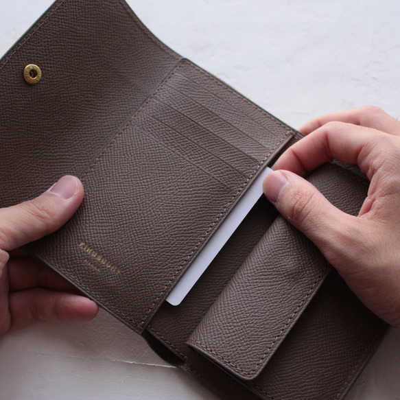 シンプル且つ大容量のミドルサイズのお財布です。 お札ポケットは2辺解放型で紙幣の出し入れがストレスなく行えます。 通常のミドルサイズのお財布と比べスリムな仕上がりとなっているため、手に握りやすくハイグレードレザーならではのコシのある質感を感じることができます。 サイズ:W14 × H9 × D3.5 仕様:カードポケット×5、フリーポケット×1、お札ポケット×1、コインケース×1 素材には多くのハイブランドにも使用される高品質なフレンチレザーを使用しております。 【 ヴォー・エプソン 】 細かな型押し加工を施した、張りがありしっかりとした質感の牛革 ヴォー・エプソンでお選び頂けるカラーの見本はこちら↓ 【 シェーブル 】 細かいシボと繊細な光沢感を持つヤギ革 シェーブルでお選び頂けるカラーの見本はこちら↓ 【 バイカラーオーダーについて 】 KINGSBURYでは追加料金無しでバイカラーでのオーダーも可能です。 商品本体の外側と内側や本体とベルト、カードポケットの一部分だけなど、可能な範囲内でお承り致します。 バイカラーオーダーでご希望の方は、オーダーの際カラー選択欄は「バイカラーオーダー」を選択して頂きまして、備考欄にてご希望の配色をご教示くださいませ。 (複雑な配色でご希望の方や、配色のバランスなどについてご相談したい方は一度お問い合わせ頂くとスムーズです。) バイカラーオーダー例↓ <ご注文方法> こちらの商品は受注生産になります。 現在非常に沢山のオーダーを頂いておりまして、お渡しまで5〜6週間程いただいております。 その分丁寧に製作を進めてさせて頂きますのでご了承頂けますと幸いです。 ※ギフト用などでどうしてもお急ぎの方は一度ご相談ください。 ご注文の際は「カートに入れる」より、ご注文の手続きを行ってください。 その他ご不明点などございましたらお気軽にお問い合わせください。 |