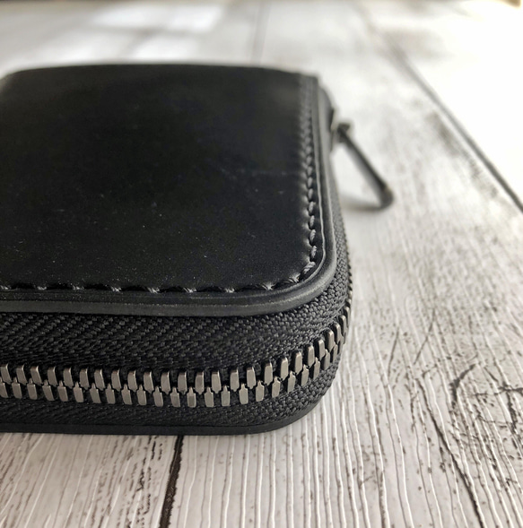 こちらは受注製作となります。お支払い完了後の製作となります。 *製作期間はプロフィールに記載しております。 別で出品中のオプションで小銭入れ横にレシートやカードを入れられるパーツを追加できるようになりました。併せてご検討お願い致します。 内装画像は小銭入れ横ポケットを付けた物になります。 オプション購入なしの場合は小銭入れ横ポケットは付きませんのでご注意願います。 【小銭入れサイドポケット追加オプション 】 外装:艶が美しく年々希少価値が上がっているコードバンの中でも、さらに入手困難なホーウィン社のシェルコードバンを使用しております。 入荷時からの薄い線キズ. 色ムラ. 毛穴など、アメリカンクオリティですが、ワイルドな天然皮革感とコードバンの艶がそれを打ち消してくれます。 内装:サドルレザー 片側マチ無しにする事でお札を折らずに入れる事を可能にしました。 他には無いタイプのお札の入れ方、出し方で 二つ折りにして入れる 出して広げるという煩わしさが無く、小銭入れも両側マチ付きで取り出しやすく 会計時に[ワンアクション]でスムーズにお支払いできるミニウォレットです。 最後の画像の様に小銭入れ部のマチを押すなどして 小銭入れを持ち上げた状態にするとお札を入れやすいと思います。入れるのは慣れてしまえば簡単です。 お札は二つ折りの場合は縦でも横でも入ります。 お釣りを受け取り、上記の入れ方ですぐに入れ難い場合にはとりあえず二つ折りで素早く入れておけばスムーズにレジから撤収できます。 お札を出す時は引っ張ればスルっと出ます。 もちろん逆さまにして振っても小銭がカード入れ側に出てしまう事はありません。 これだけで財布としての機能は充分ありますので小さなバッグで出かける時にも重宝します。 ファスナーはYKKエクセラを使用しており、務歯全てに磨きがかけられている 非常に綺麗なファスナーで使い込む程滑らかになっていきます。 金具はゴールド (ゴールデンブラス) シルバー(ニッケル) 布地は黒 焦茶 ベージュ、から選択できます。 (ファスナーその他カラーをご希望の場合は別で出品中の【ファスナー布地. 金具取り寄せカラーサンプル】の方を一緒に購入して下さい) 【ファスナー布地. 金具取り寄せオーダー用ページ】 素材 外装 Horween shell cordvan 内装 サドルレザー カード入れ3段×2 サイズ 約11×9.5×2.5 (cm)